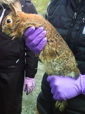 The rabbits DO have very dangerous back feet - that's why we clasp them with our hands like that! It's easy to keep them in check if you've got a firm grip on their hind legs. Squirrels are MUCH harder to hold, and they'll try to bite you like crazy!
