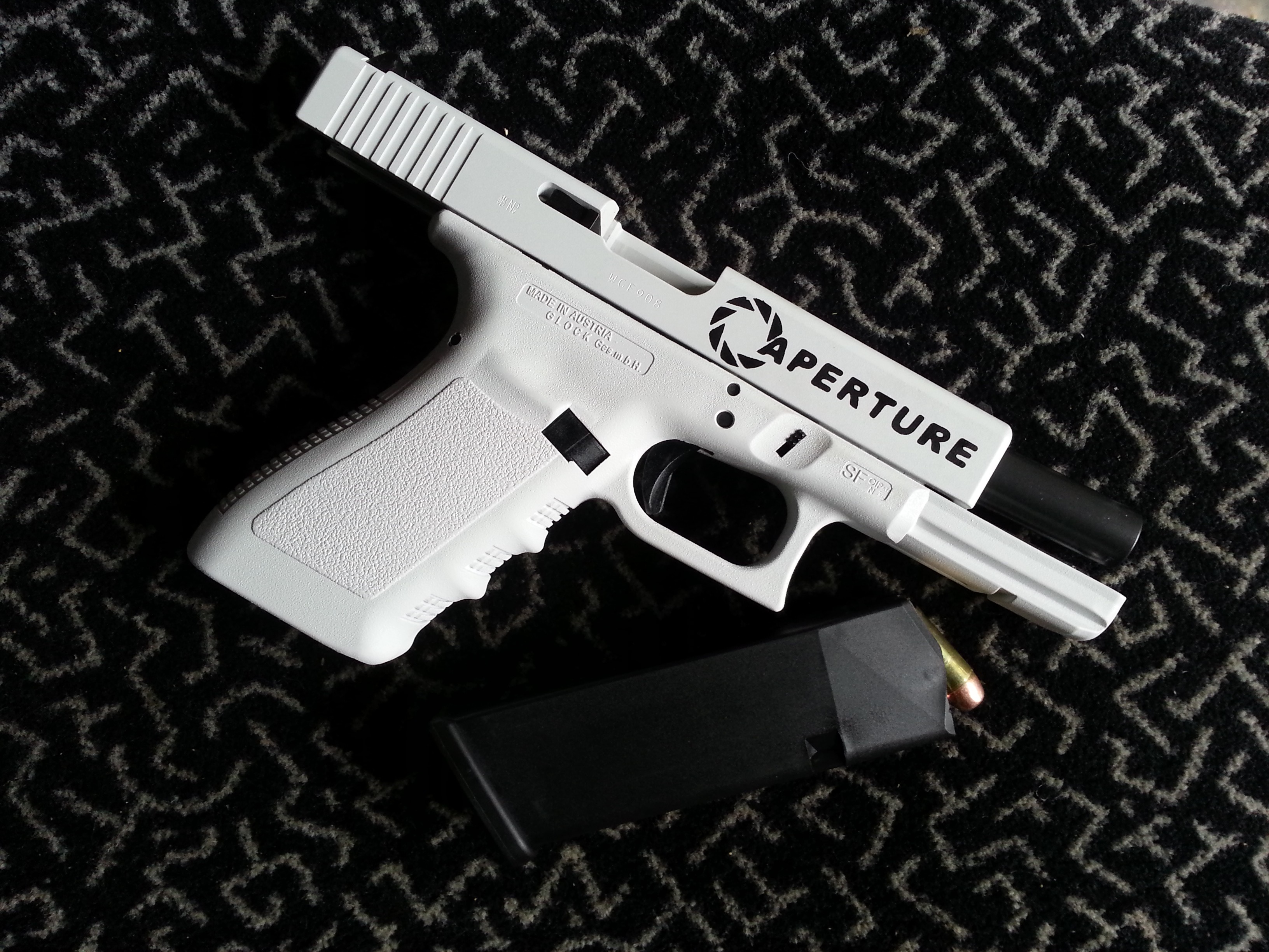 Just for you, collection of my handguns, the three MR-73 then a 1953 Browning hi-power, Steyr C9-A1 and Glock 20 with (obviously) portal-related paint job.