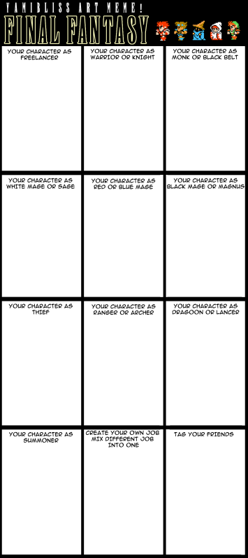 Yeah I created an art meme a Final Fantasy one. =P I hope you guys enjoy this one. If you want to try it go right ahead. If you do put a link to that clear one and also put a link of your meme here so other people and I can see your creation. =3 have fun all! XD