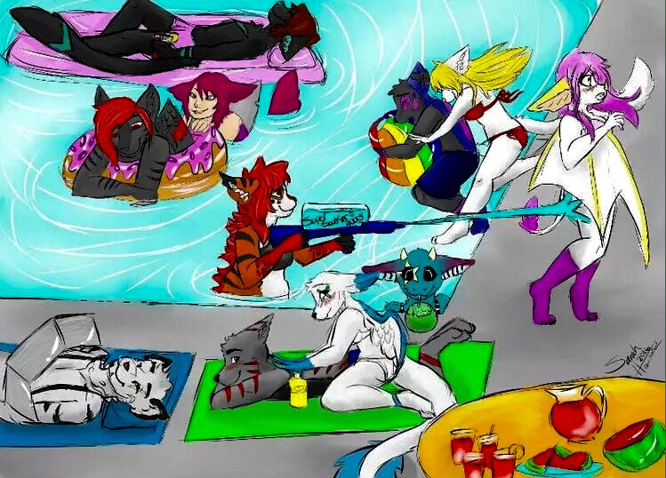 A big group picture by SarahSmash, Alexandra in the pool, also a kitty named evera shooting a water gun, wish I remembered all the other characters but it's and old thing, sorry for the kinda blury quality I had to go searching for it and didn't have the best quality when I did but yea
