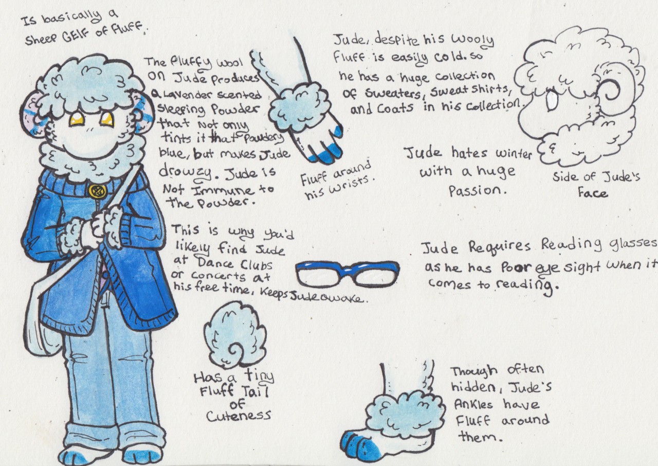Physical Description: Jude standing at 4'0", is in a word, a small fluff ball Sheep GELF of wonders. His hair, neck, wrists, small fluff tail, and ankles are covered with this wooly soft fluff giving him a sheep like appearance, his curled antenna doesn't help this much either. To stand out against the blues, Jude has round yellow eyes to make one think of the moon. Due to the naturally occurring sleep powder in his wooly fluff, it pigments Jude's fluff to this pastel blue. If Jude were to pat the sleep powder, it'd be white and produce a sleepiness cloud. Jude is primarily white with the antenna dyed to have blue stripes against a super light lavender while his toes and finger tips are dyed blue.