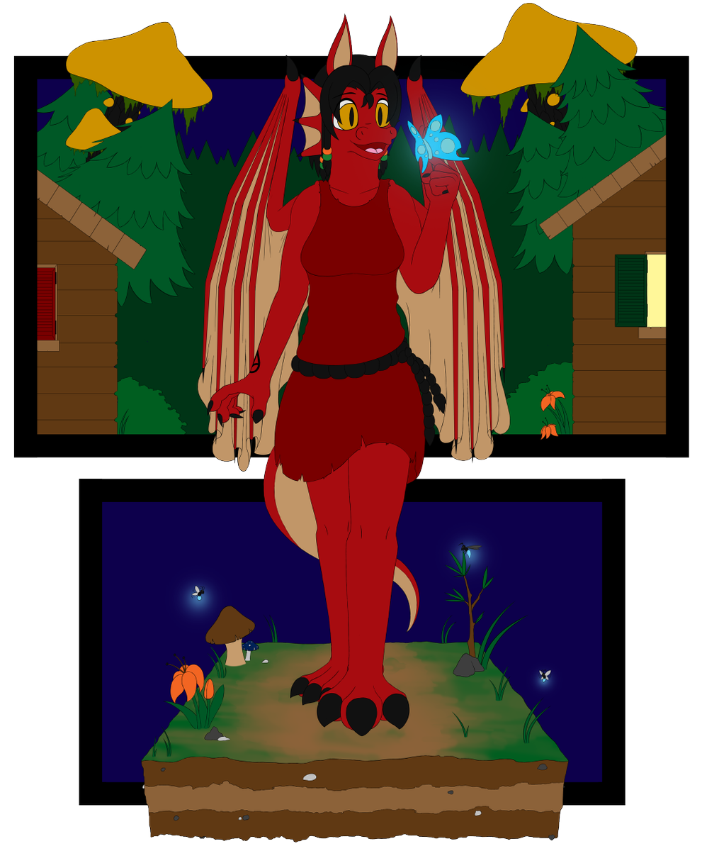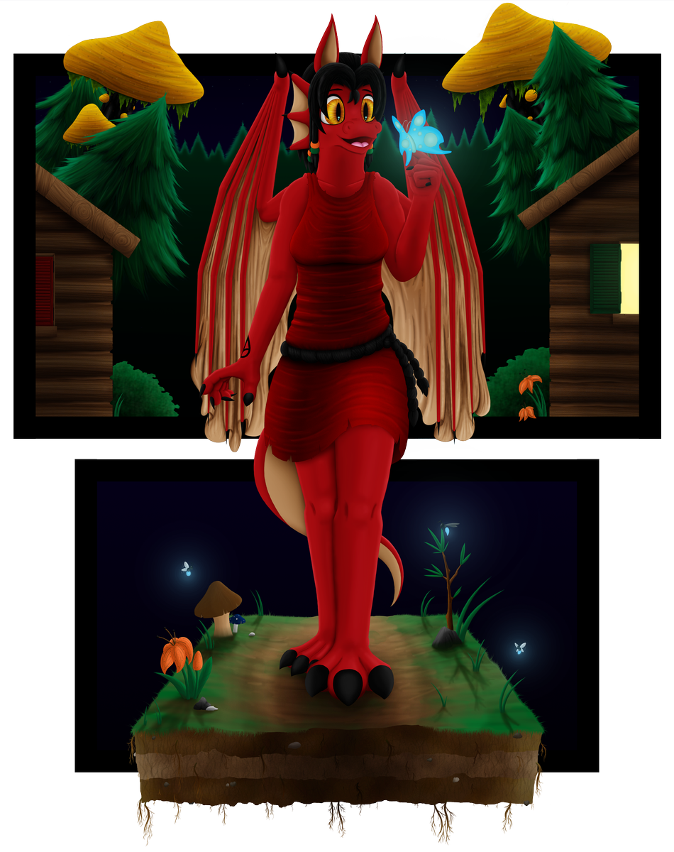 I went almost all-out with this one and experimented like crazy, particularly with the lighting. Firstly, I opted for a night scene since not only was that something I didn't do very often (or at least not very well, anyway), but it would be an ideal opportunity to experiment with both lighting and shadows. A lot of blues, both bright and dark, were applied, though the glow from the window helps to provide some additional contrast. I also added some bio-luminescent insects to add even more contrast to the otherwise dark image. That moth in particular (which I've taken to calling the "Moondust Moth") was a golden chance to also show some of it's vibrant light reflecting off of Sharon's face. Making Sharon's eyes stand out was also a priority; not only to provide additional contrast, but also for lore purposes. When I redesigned her, I wanted to establish that her eyes especially stood out in the darkness - not quite glowing, but definitely sticking out. I think I may have been able to do more, in hindsight, but it does the job adequately.