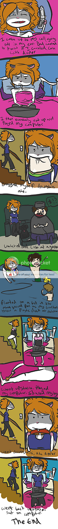 LAWL. It was actually from a thread about 'draw your day, with your 'sona representing you'. I was too lazy to make my brothers and dad anthro. Plus, the blonde one is supposed to be either of my youngest brothers, so if i anthro-ized them, the fat one would know i refused to draw him. :x