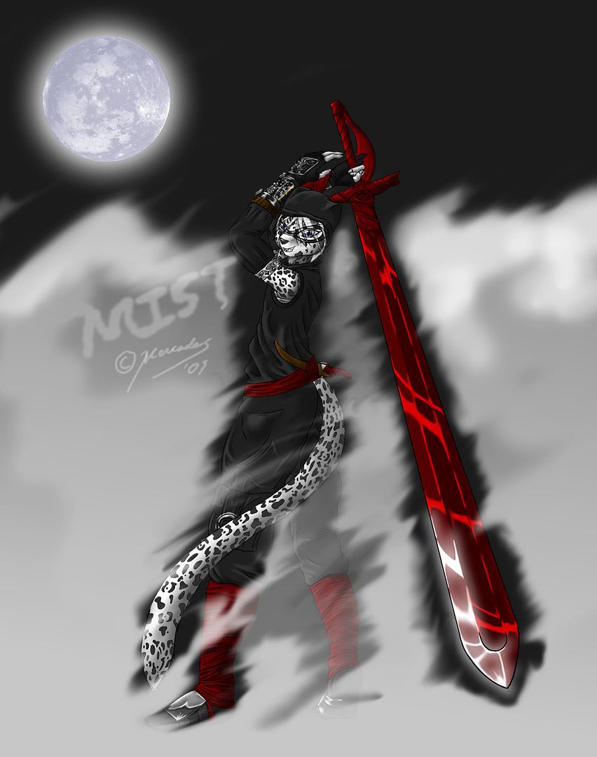 In this pic, Mist is wielding the one real trump card: A scarf! Yes, the scarf is fabric, but it can get as hard as steel (or that's about what they know, since it took a blow from Hunter's axe and it -is- made of steel). She hates using it, though, because it's a trump card: there's no sense in anyone knowing about it. x)