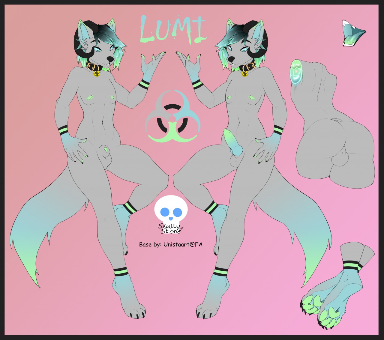 sheath radioactive neon blue green grey black horns wolf canine male femboy stripes claws cute collar goldReport this content
