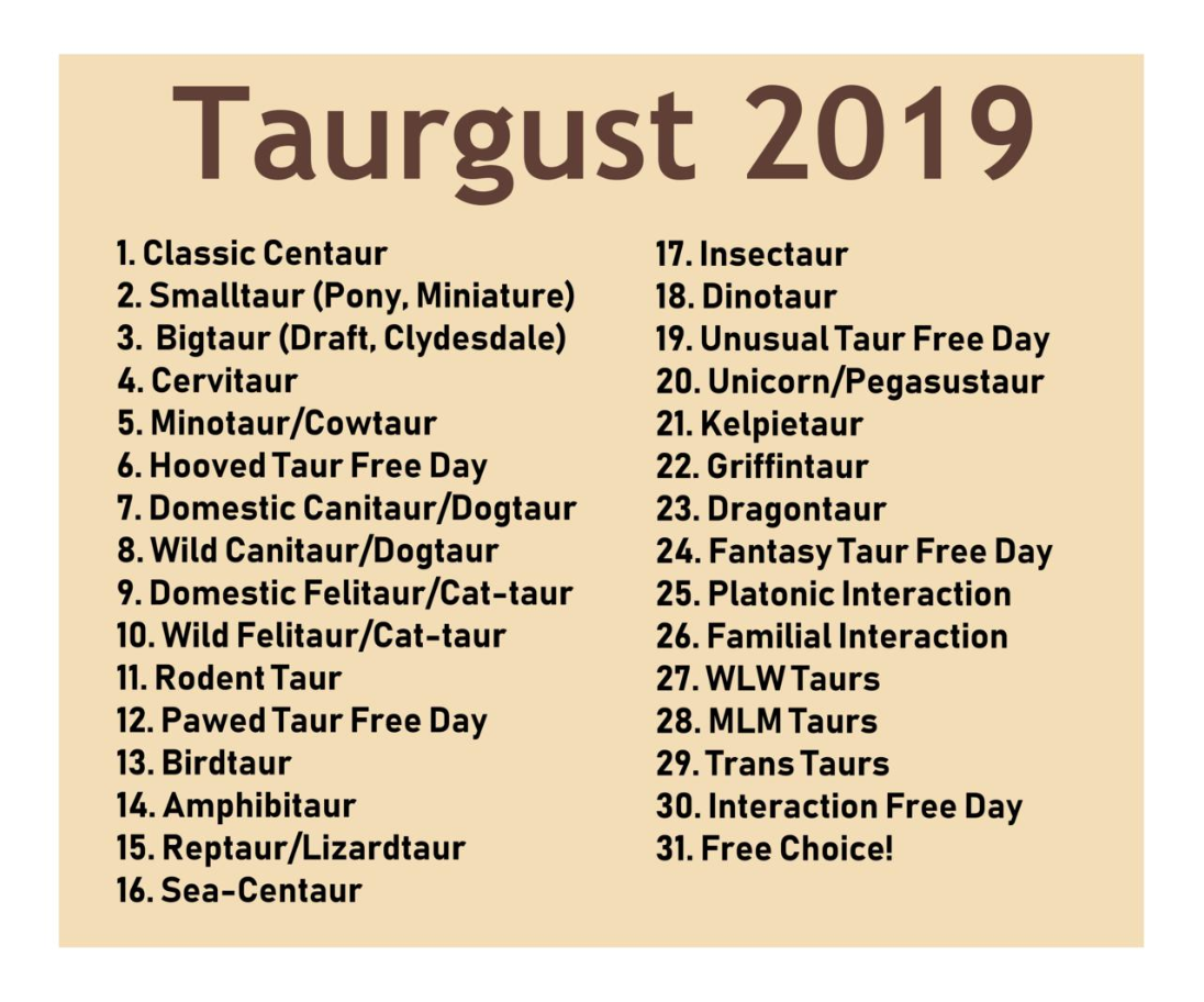 Taurgust is an art challenge where you draw a different type of taur for each day for the month of August.