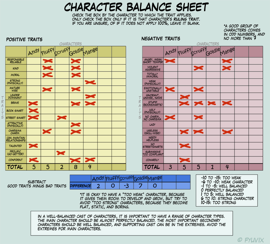 After filling in the chart and looking it over, some underlying relationships between the characters becomes clear. For example: Andy and Fluffy's traits both tend to compliment each other: One is wise, the other isn't. One is charming and kind, the other isn't. Each is what the other isn't, and aren't those the best kinds of pairings?