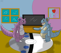 "Come over, let's watch a movie together!" Nidoqueen called for her King. Nidoking came from the kitchen and walked towards the sofa, letting out a big burp. "I'm so full... you shouldn't have ordered THAT much..." She giggled. "Though, you managed to eat it all! That's what counts my King." He sat down next to her, and she gave him a full bag of poffins. "Dessert time!" Nidoking moaned lightly, but opened it and began to eat. She looked at him without him noticing, and saw that her King has gotten a little chubby. "Looks nice on him... more would be even better." She thought, smiling .