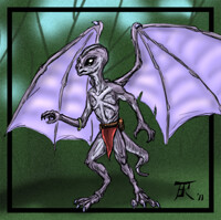 The Tupijur Droyne, like the rest of their brethren on Aduhappa (Trans = Banded world-sky), are mottled light grey and white Droyne of average size, but with large wings that are fully functional in the low gravity and standard density atmosphere of their homeworld. They tend to be even more isolationist than average, though starfaring Sports and Leaders from around their solar system do visit to pay respects to the spirits of the builders, and to visit the floating museum at The Eggs, the spindly structure seen free floating in the background.