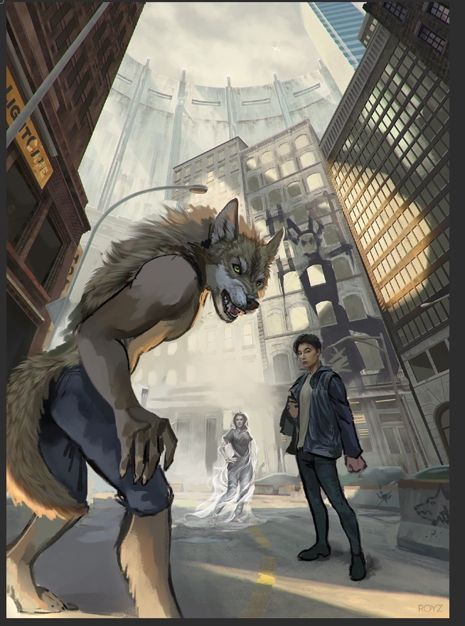Что я бы по итогу изменила: увеличила бы мужского персонажа, потому что на текущий момент он занимает непропорционально мало внимания в композиции, а так же сменила бы ему и оборотню позу конечностей. Прикрепляю небольшой редлайн, как один из вариантов мыслей: https://i.gyazo.com/48cf63aa41752a6.....e3789222f5.jpg