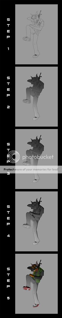 STEP 5 - Now this is when you see the fruits of your work. I created three more layers: One set to Color, one to Overlay and one to Soft Light (all clipped to the overlay layer as well). The Color layer is for soft colors, the Overlay layer is for vivid and intense colors, and the Soft Light layer is for painting black surfaces (because the other two can't work with black). The reason for setting them to different blending modes is to allow their colors to blend with the layers underneath. Just look at step 5. There is nothing else there besides plain color, no special effects added other than the blending modes. It felt magical and it felt so natural. The shades and highlights automatically adjust their tones to match the color of that region, everything just fall into place automatically and save you a lot of fine tuning work. After I finished coloring, I took the time to add some other special touches such as the shine in his eye and a texture to the red area of his shoe's sole.