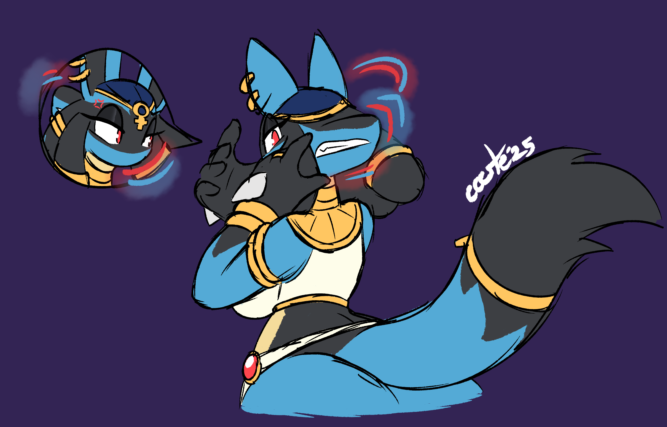 A certain magnetic "friend" was bored one day and decided to toy with Asuna for fun. With a little "push" he swapped around Asuna's muzzle to the back of her head, much to her chagrin. Her muzzle is still fully functional to vocalize her frustration, yet her eyes above her empty face shoot every and anyone daggers if they stare for too long. She's more than just miffed at her new look.