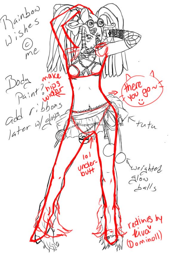 Thankies verreh much!!! I tried really hard on this one xD I had to collect several different raver pics in order to get an idea for everything i wanted on her. xD Her Tutu is going to be -fun-. I know I'm going to turn the opacity down on it for the coloring, but I dunno how to do the line art for it... Guess I shall figure it out as i go? xD