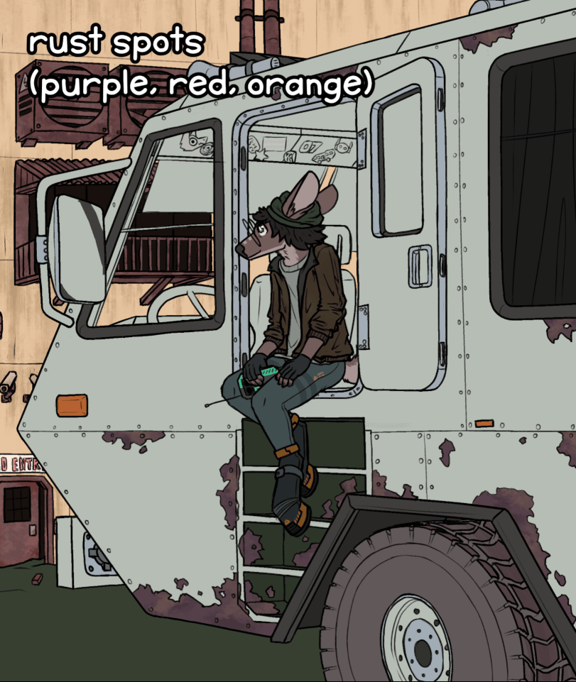 for the wall texturing, i started by getting good references. i had gone to a local railroad museum recently, and i took a bunch of pics of some of the junker trains they had there, link here. i looked at the references and tried to break down what made up the overall appearance of the decay - in this case it was rust spots with peeled paint, vertical rust stains from rain, faded paint, and a faint layer of surface dirt. i went through my brushes and found ones that best matched the texture of the specifics bits of the grime, then drew the individual layers, stroke by stroke (i can share my brushes with you if you'd like! having the right brushes can help a lot). i was switching up the brush size as i went to avoid repetition, and for the vertical ones i used the ruler tool to keep them even. here's a gif of the process. i hope this helps! honestly you could probably get away with getting a texture png and using the right overlay mode, i do that most of the time, but here i wanted to practice doing the texture myself. the background wall is done in a similar way, i just looked up pictures of weathered concrete blocks instead