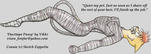 rubbervixen art work http://www.bondofox.net/galleries/v.....tapedpussy.jpg starting a long term admiration for Vikki. I digress, I thought the concept of a shaven cat was well different, and the choice of duct tape for clothing, not for the sake of the norm of bondage also provided an interesting twist, and on a child like curiosity like a kitty and well the character basically could play itself.