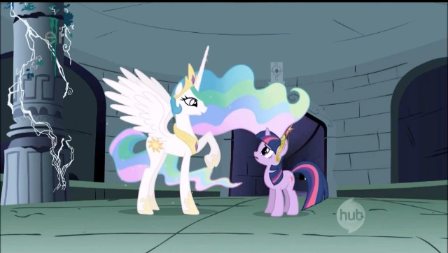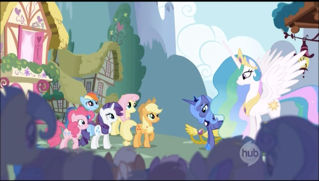 Unfortunately, there's only one character we've seen more than once who interacted with Luna close enough to get a good idea for her size in the two parter, and that's Celestia, who rarely interacts with others. Luna is also on-screen for a grand total of maybe two minutes in her only appearance before. And from what we see, it looks like Luna is somewhere between Twilight and Celestia in height, though admittedly closer to Twilight. Here, I grabbed some screenshots of like, the only time we get a good shot of the height differences.