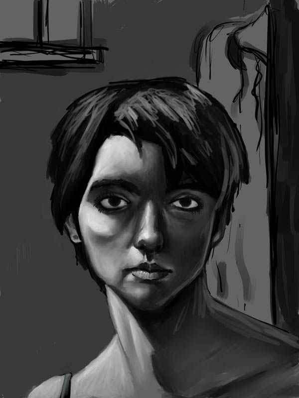 Your contrast and use of value are great so far! You might wanna push the darks and lights a bit more depending on the end feel you want of this.