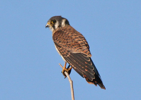 *note* After a friend pointed this out, I felt I should mention it too! Kisra is going a little 'gray' in her old age, which makes her plumage slightly bit unusual! For reference, here is a (younger) female American Kestrel - http://nathistoc.bio.uci.edu/birds/.....tember%29b.jpg you can see that there's much more bright red on the wings!