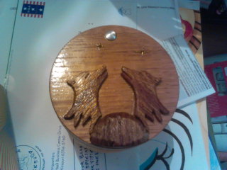 The wood used : Oak *for the lid* black oak *for the rock* and African mahogany for the wolves :3