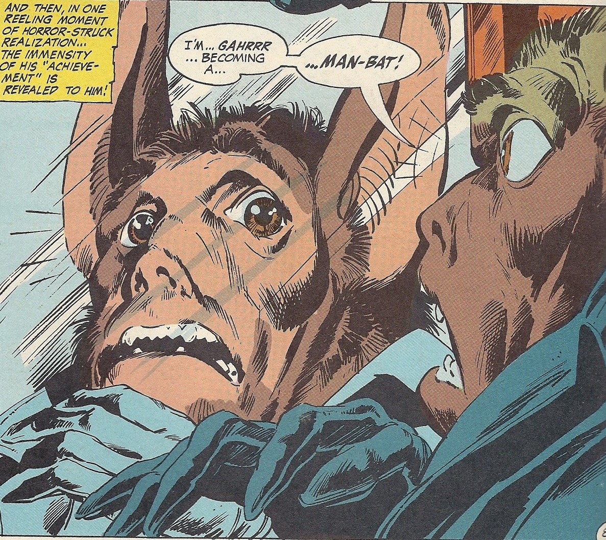 In the very first Man-Bat story (one of Batman's villains) there is the perfect mirror shot when the guy first sees his reflection. (Up to that point he had no idea he had tf'd.)