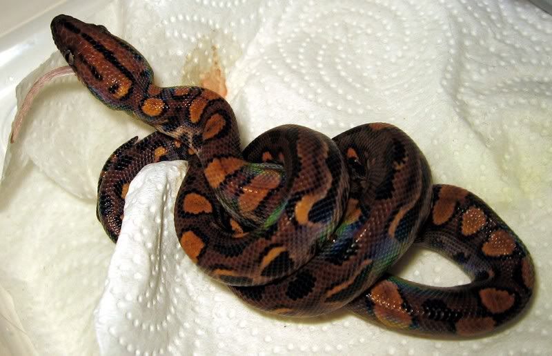 Don't mind the tail, he just had dinner. That's the best photo I could find right off to show the rainbow effect. It's rather hard to get on camera.