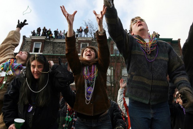 anyways, kitten is catching beads at a St. patty's day parade! hopefully it's at least somewhat obvious that she's considerably higher up than the people around her- she's sitting (or more like kneeling) on her protector/ caretaker Mike's shoulders. St. patties day is kitten's favorite holiday, because her favorite color is green. she even dyed her hair for the occasion. (normally its just black)