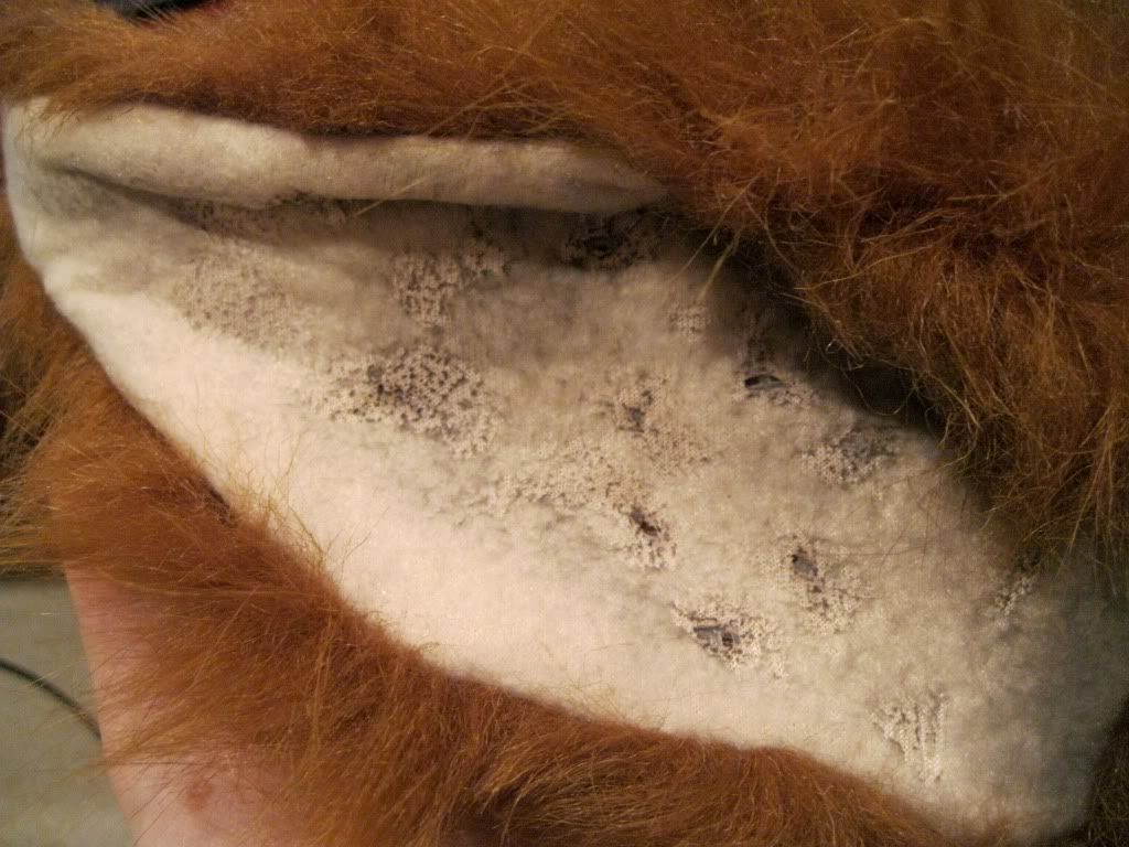 • Fursuit head: Mostly moving jaw, large ears that stay back, Hood that slips over the head and elastic straps. My and my boyfriend's heads are around 23-24 inches around. so keep that in mind! The nostril holes are drilled. and vision through the tear ducts. Ventilation is okay but not particularly fabulous. :b Head is not lined and I suggest wearing a balaclava with it!
