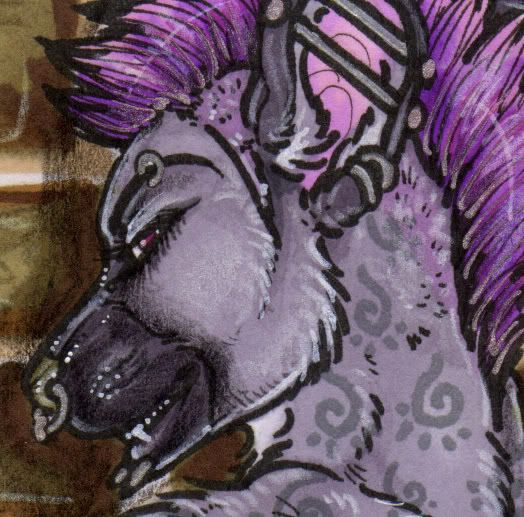 I like the design of the hynea, too. Stone gray-blue with little dark swirl patterns makes the fur detailed in a fun way and very interesting to the eye. also interesting and curious are the long rods peircing her inner ear, and the fun purple mohawk. She does seem to be a 4-breaster fur if you look close enough (by the 2 breasts to the side.)
